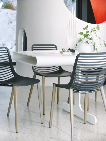 Lightness is elegance and essentiality, it’s project comes from the idea of lightness as essential sign of the contemporary design. The horizontal scan of the backrest and the particular shape of the lateral uprights give personality and character. The shell, made of nylon in different colors, is light and resistant and it combines itself well with different base versions said in :the side chair with round or square metal tube frame or a sled frame, the armchair with a round metal tube frame, all stackable, chromed or painted for indoor or outdoor use; or a cast aluminum base version on casters adjustable in height further to a natural or stained beech wood base. The collection is completed with stool and line seating versions.